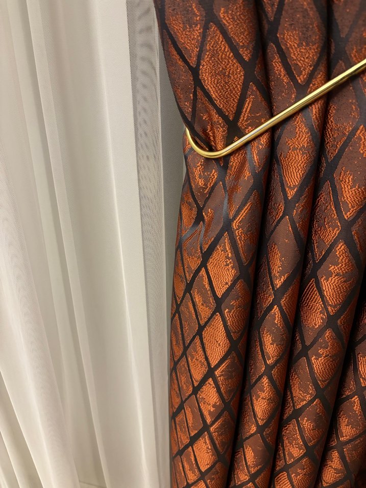 Parlak kahverengi yılan desenli, modern klasik tarzda perde, mekana şık ve özgün bir hava katıyor .