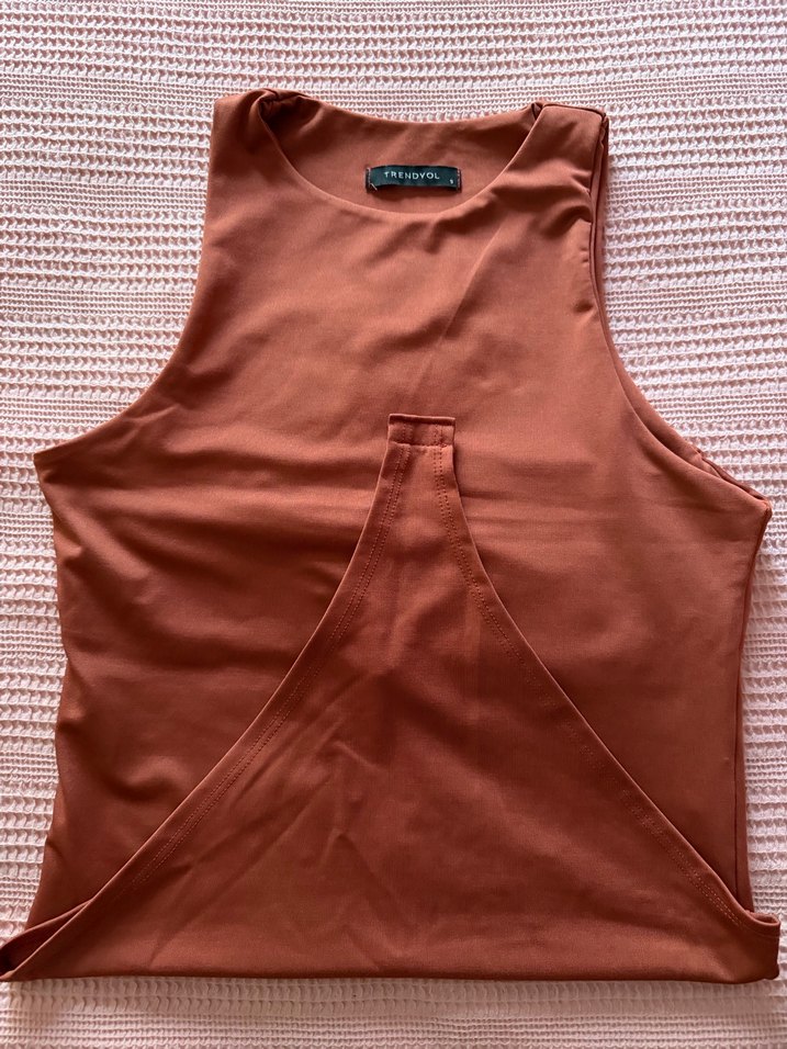 Parlak kahverengi renkte, yüksek yakalı ve kolsuz. Normal uzunlukta ve emzirme kolaylığı sağlayan açılır panele sahiptir.