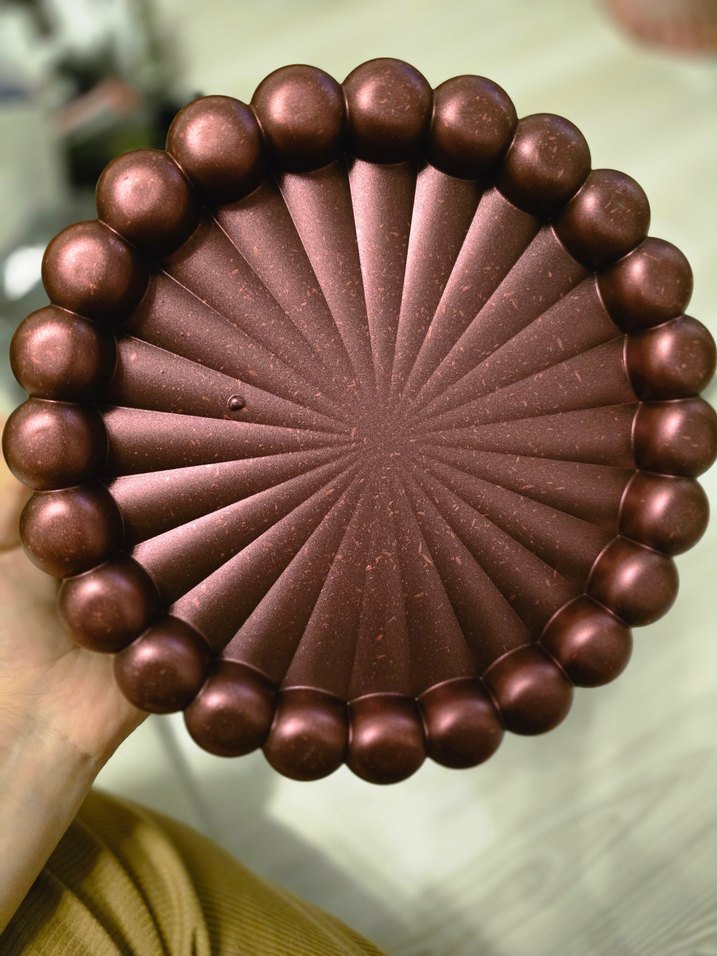 Parlak kahverengi, yuvarlak ve dekoratif kenarlı kek kalıbı. Pürüzsüz ve parlak yüzeye sahip, kenarında eşsiz desen bulunur.