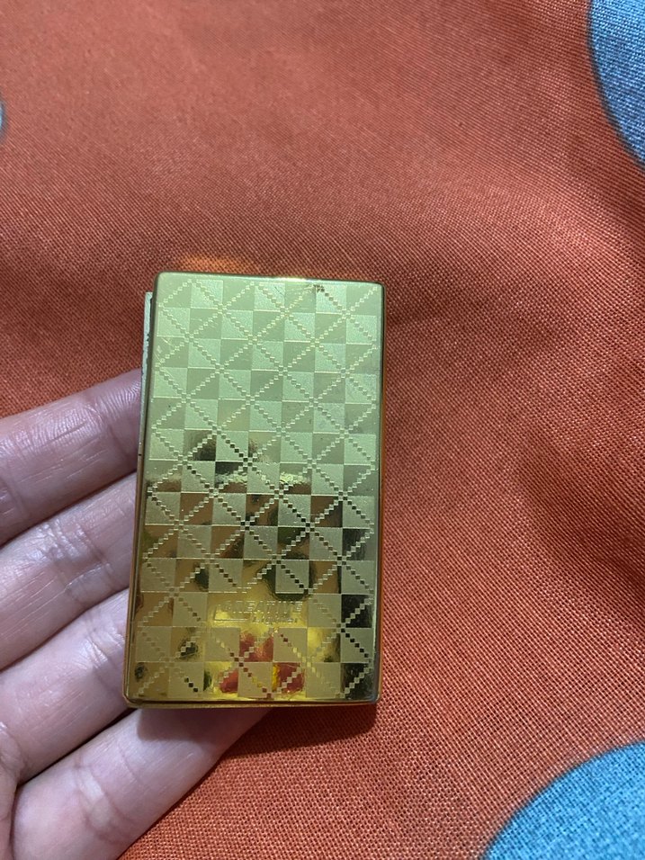 Parlak kare desenli ve parlak yüzeyli altın renk erkek kartlık, vintage karşı kültür tarzını yansıtıyor. ✨