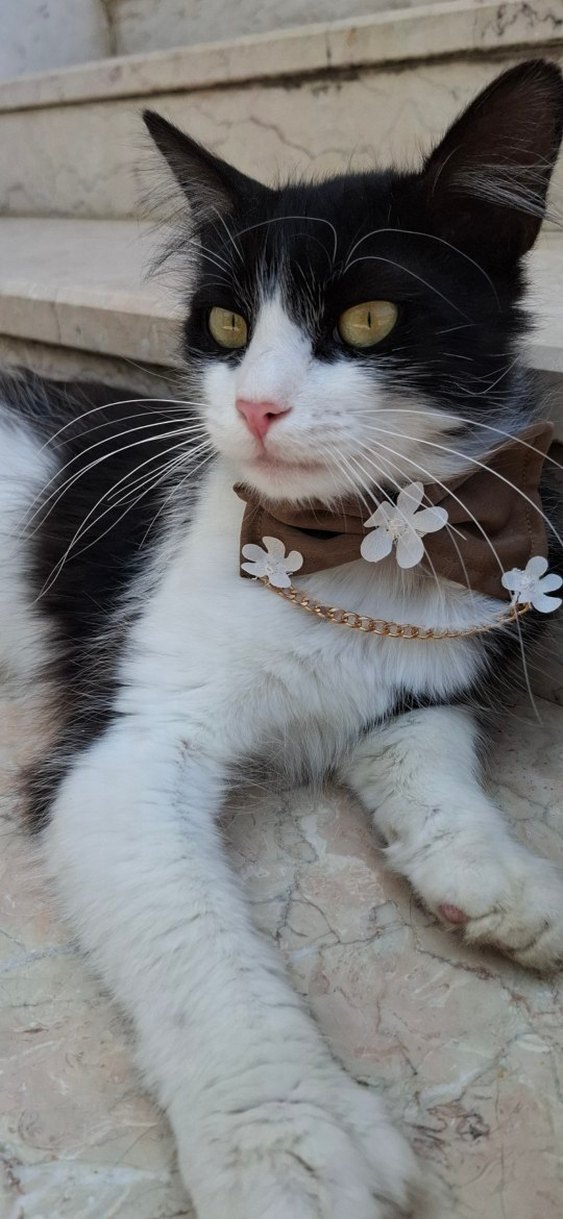 Beyaz parlak çiçek detaylı ve altın renk zincirli kedi boyunluğu.Arkası lastiklidir.