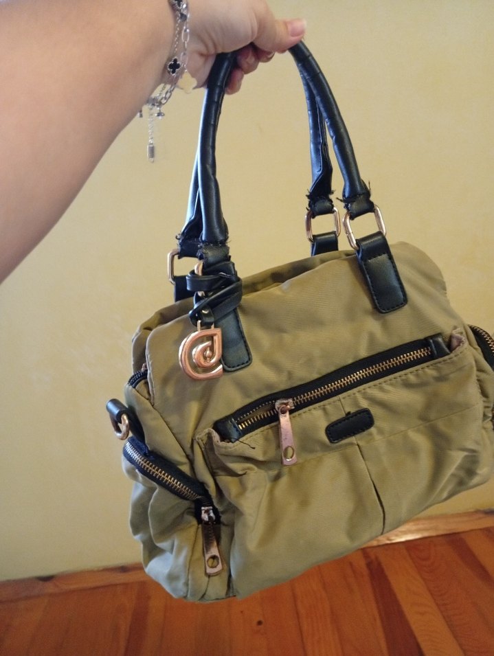 Parlak detaylı, tokalı khaki deri kadın çantası. Çoklu fermuarlı bölmeleri ve çift saplarıyla günlük sokak stili için uygun.