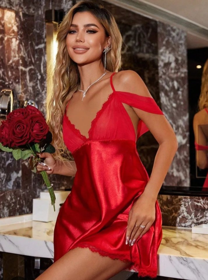 Parlak kırmızı, askılı ve bohem tarzda, vücuda oturan midi boy gecelik. ✨