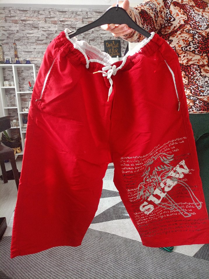Parlak kırmızı renkte, baskılı ve fermuarlı cepleri olan bol kesim erkek deniz şortu.