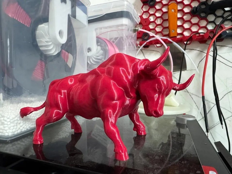 Parlak yüzeye sahip, detaylı kas yapısı olan canlı kırmızı boğa figürü. 3D yazıcı ile yapılmıştır.