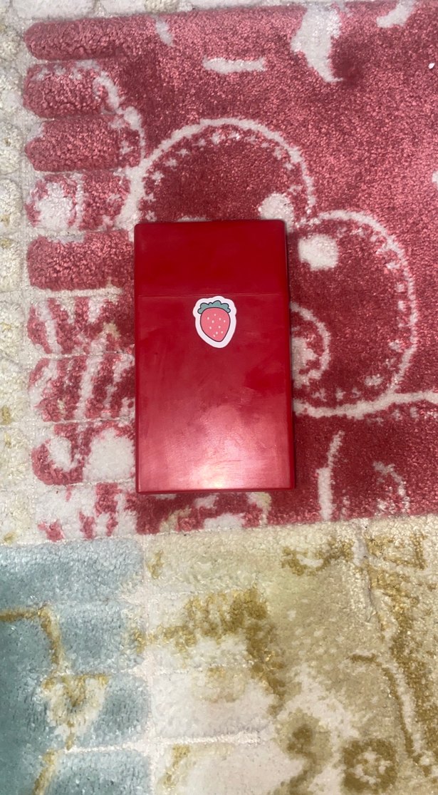 Parlak kırmızı ve parlak görünüme sahip, çilek desenli telefon kılıfı.
