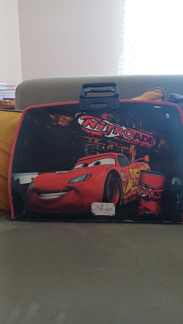Parlak kırmızı renkte, yarış arabası desenli çocuk okul çantası.