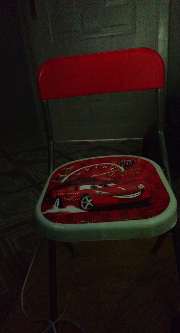 Parlak kırmızı renkte, oturma kısmında eğlenceli çizgi film araba deseni bulunan çocuk sandalyesi. Metal ayaklı ve sağlam sırt dayanağı mevcuttur.