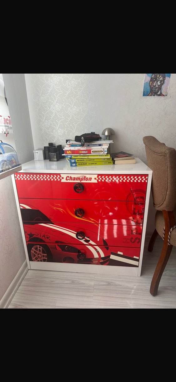 Parlak kırmızı renkte, yarış arabası desenli ve üç çekmeceli çocuk şifonyeri. Üst çekmecede 'Champlon' markası bulunur.