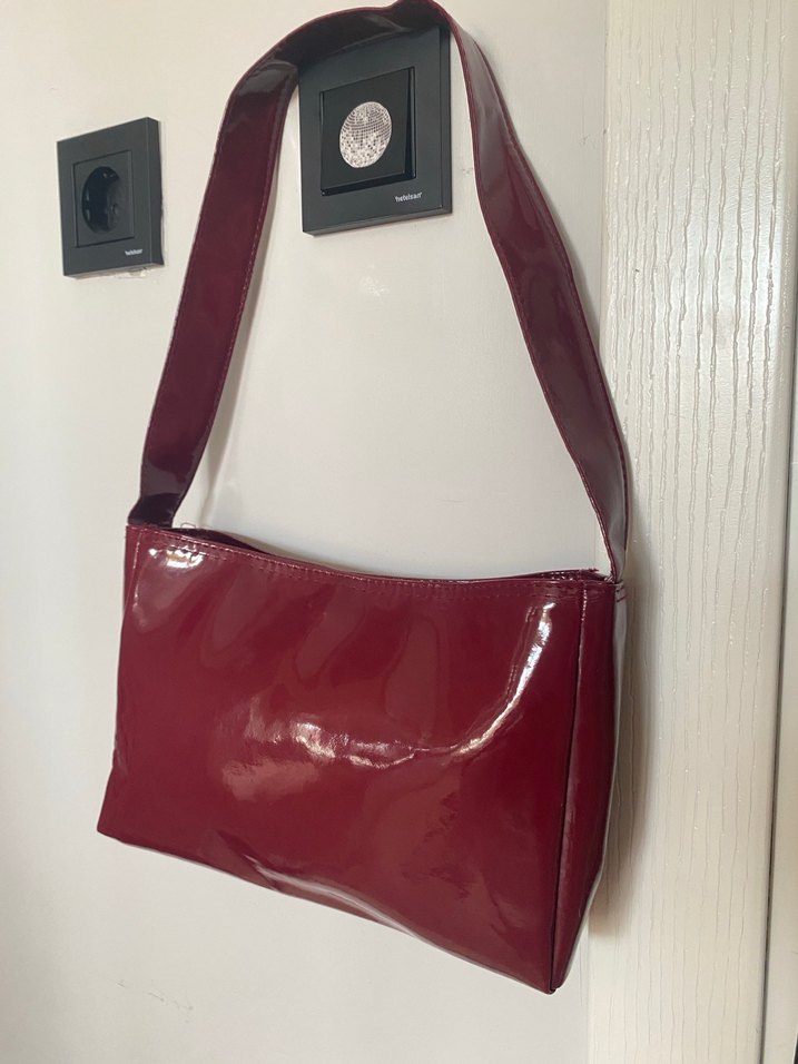Parlak kırmızı deri kadın omuz çantası, minimalist ve cesur tasarıma sahip. Günlük sokak stiline uygun, parlak ve desensiz yüzeyli.