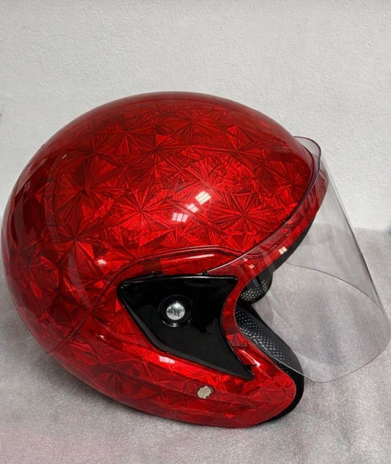 Parlak cam malzemeden yapılmış, kırmızı ve kristal desenli motosiklet kaskı sifirdir farkli renk sipariş isteyene yapilir