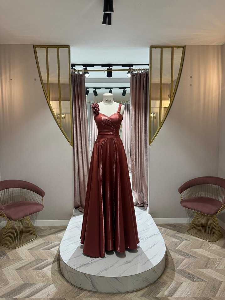 Parlak kırmızı renkte, drapeli ve nakışlı detaylara sahip straplez uzun abiye elbise. Kolsuz ve klasik modern tarzda, düğünler için uygun.