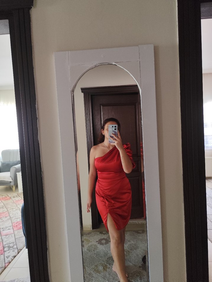 Parlak kırmızı kumaştan, drapeli ve tek omuz askılı, vücuda oturan midi abiye elbise. Romantik akşamlar için uygun. ✨ mezuniyetimde kullandım sadece