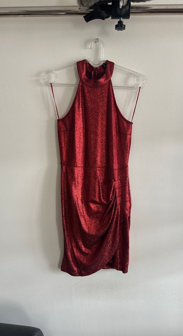 Parlak kırmızı kumaştan, yüksek yakalı, kolsuz ve drapeli tasarıma sahip, vücuda oturan midi elbise. Parti için şık bir tercih. ✨