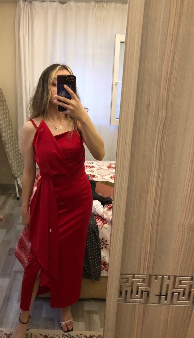 Parlak kırmızı, drapeli ve askılı yakalı, ipeksi dokulu midi elbise, cesur ve romantik geceler için uygun. Sadece bir kez giyildi elbise 38 beden fakat,36 bedenler de tercih edebilir