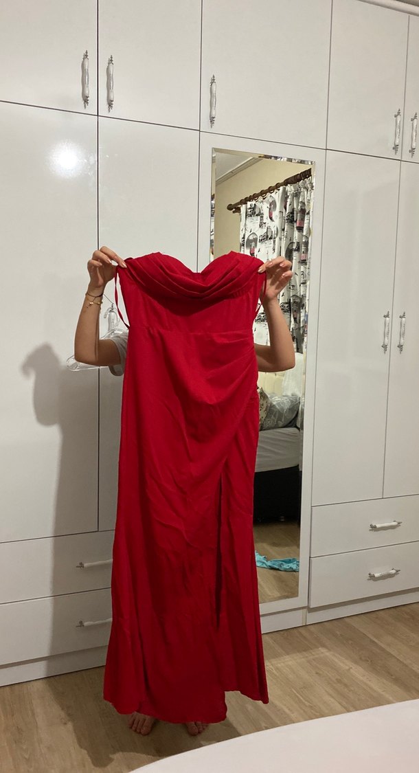 Parlak kırmızı kumaştan, drapeli yakaya ve straplez tasarıma sahip, vücuda oturan maxi uzunlukta elbise. Romantik gece için ideal, minimal bohem tarzda. ❤️