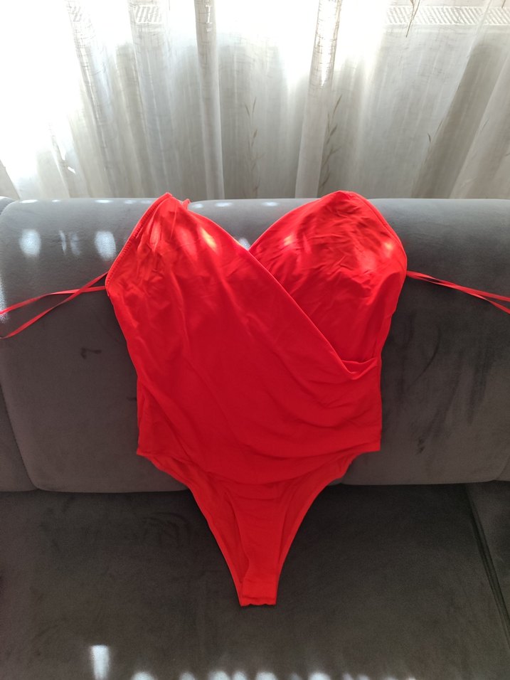 Parlak kırmızı, strappy askılı ve drapeli tasarıma sahip bu vücuda oturan bluz cesur ve avangard bir görünüm sunar. Midi uzunlukta ve pürüzsüz kumaşlıdır. Etiketi kesiktir. Sorunsuz.