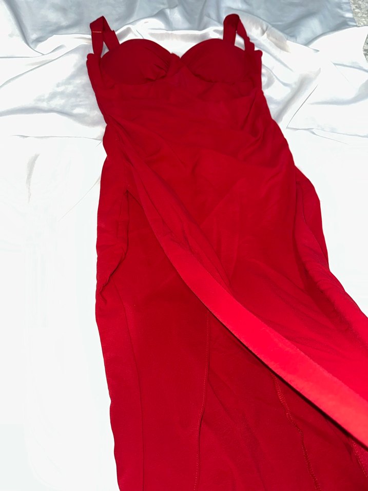 Parlak Kırmızı Drapeli Uzun Abiye Elbise Göğsü pedli