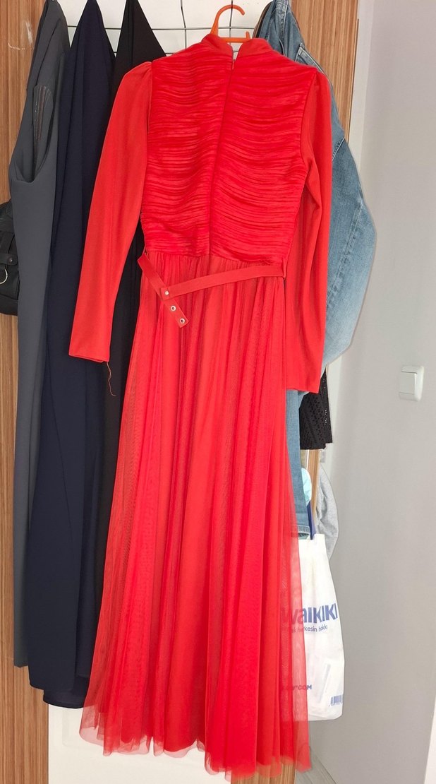Parlak kırmızı sentetik kumaştan, drapeli ve yüksek yakalı, ince kesim uzun abiye Askılı kollu, modern klasik tarzda, parti için uygundur. AIKIK markalı. Çok acil satmam gerekiyor almak isteyen olursa mesajda olabilir size çok acil satmam gerekiyor