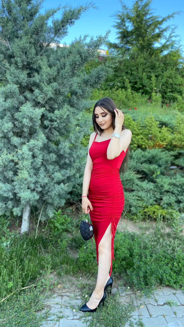 Parlak sentetik kumaştan, drapeli detaylı ve askılı uzun, dar kesim kırmızı elbise, romantik akşamlar için uygundur. ❤️