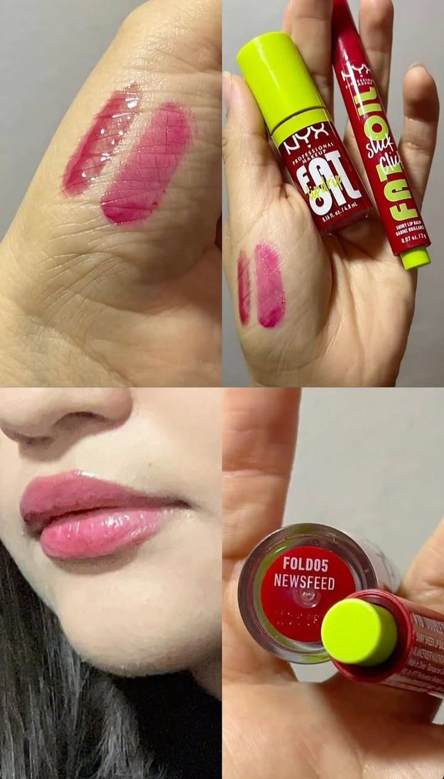 Parlak kırmızı renkte, canlı ve parlak dudak parlatıcısı. Üzerinde NEWSFEED ve FOLDO5 yazıları bulunmaktadır.