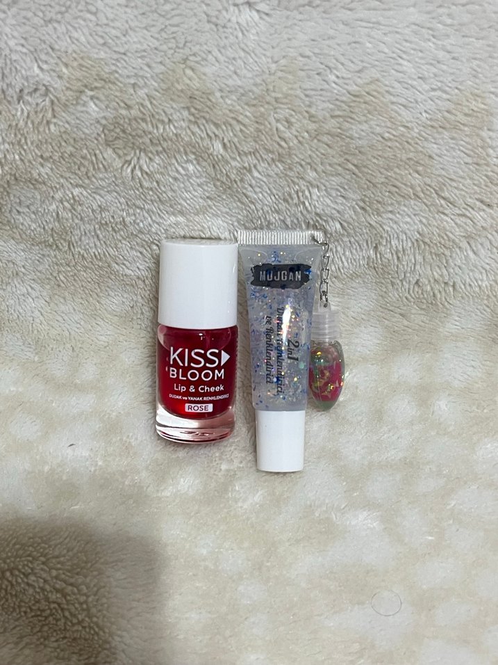 KISSI BLOOM ve MUJOAN markalarına ait parlak kırmızı dudak parlatıcısı, canlı renk ve parlaklık sağlar.