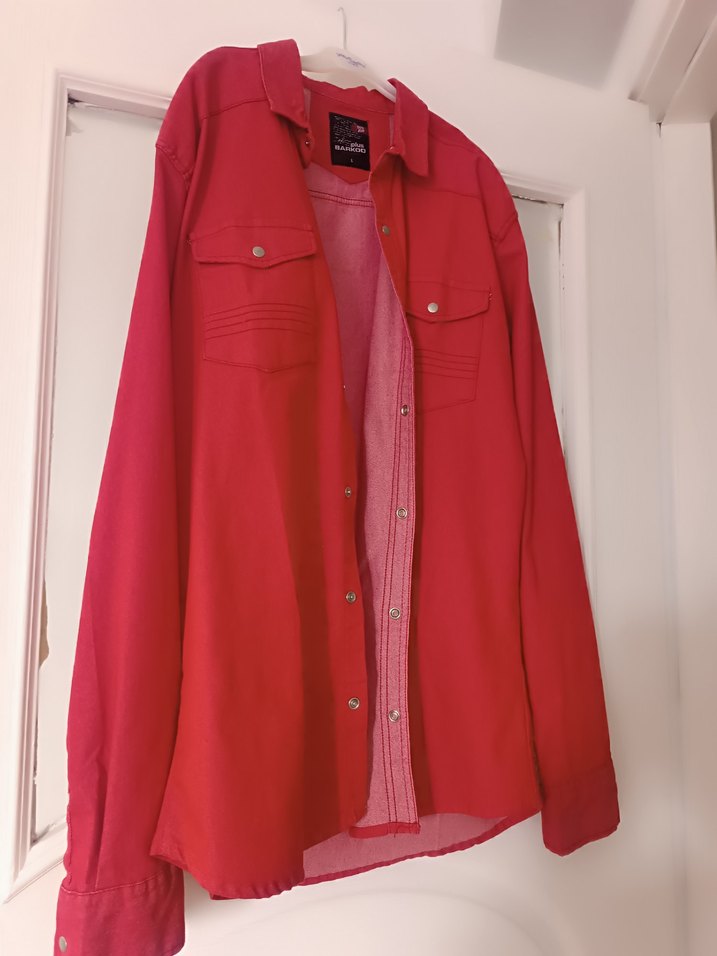 Parlak kırmızı renkte, düğmeli ve çıtçıtlı, notalı yaka ve uzun kollu erkek gömleği çok güzel kaliteli