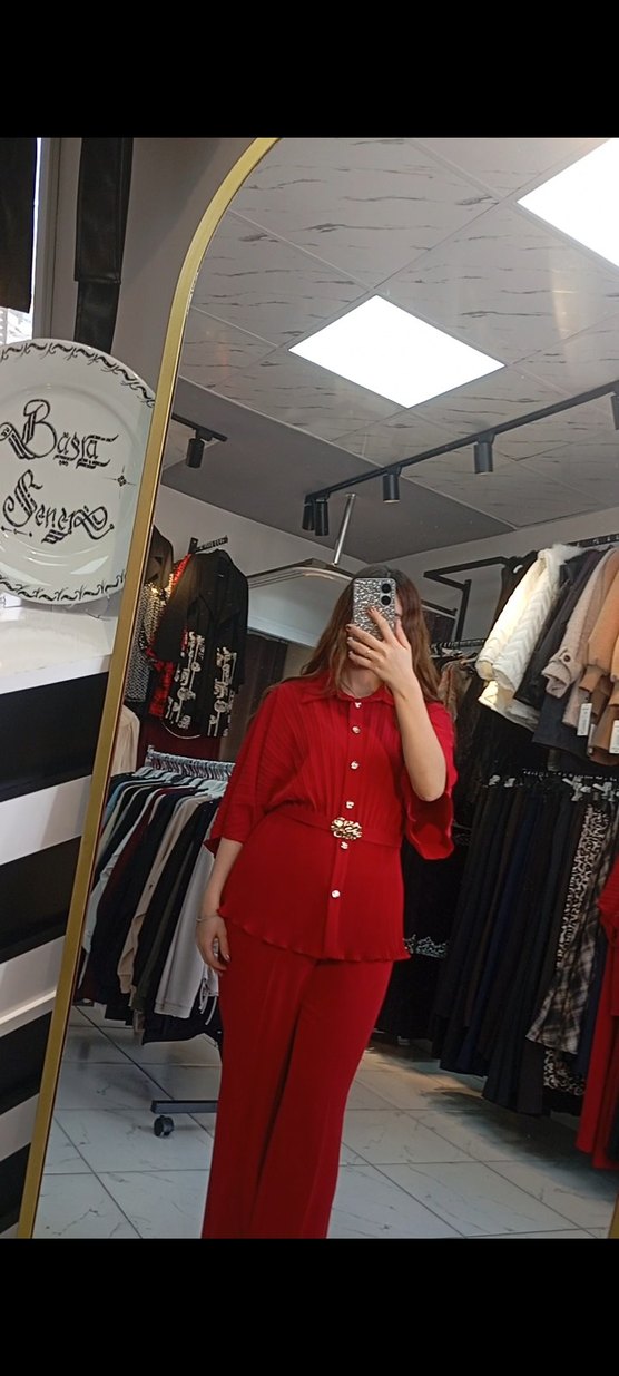 Parlak kırmızı renkte, düğmeli, midi boy ve regular fit kadın takımı. Uzun kollu, yakası kesik ve satenimsi kumaştan. Cesur Paris tarzı sokak giyimine uygun. ✨Bedenler mevcuttur