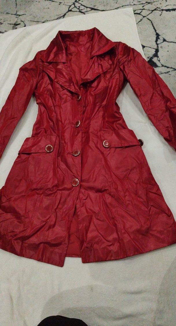Parlak kırmızı, satenimsi kumaştan yapılmış, düğmeli ve kesimi vücuda oturan uzun kadın kabanı. Notlu yaka ve uzun kolludur, desen içermez. tertemiz hiç bir kusuru Yok mağazadan alınmış gibi