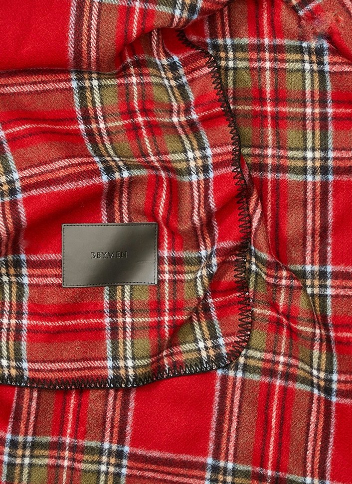 Parlak kırmızı ekose desenli, yumuşak dokulu battaniye. Şık etiket detayı bulunur. ️