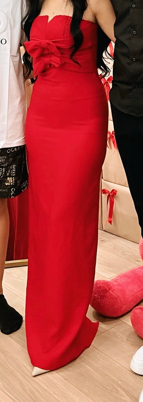 Parlak kırmızı, uzun ve drapeli şık ve iddialı görünüm sağlar. Göründüğü gibi öeyizde tek giydim