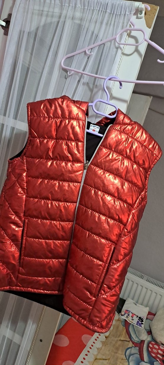 Parlak kırmızı sentetik kumaştan, fermuarlı ve yakalı, normal uzunlukta, kolsuz fit kesim çocuk yelek. Sokak ve athleisure tarzına uygun.