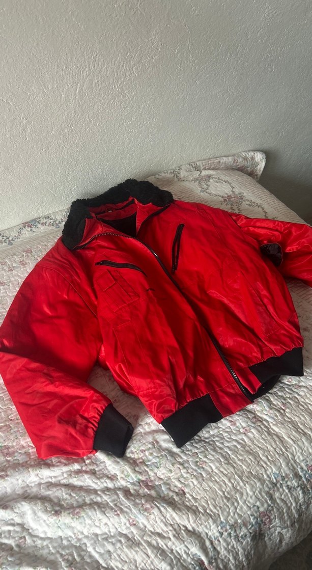 Parlak kırmızı renkte, fermuarlı cepleri ve yakalı uzun kollu tasarımıyla, yumuşak ve sıcak tüylü kumaştan yapılmış, dar kesim erkek kayak ceketi.