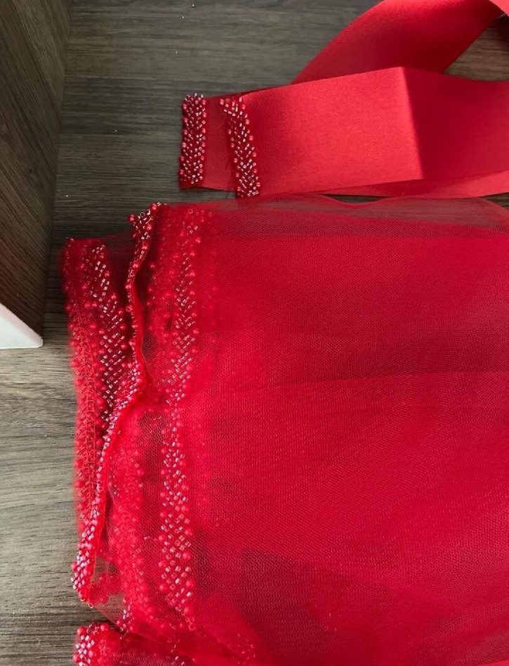 Parlak kırmızı renkte, fiyonk detaylı ve bohem tarzda düğün aksesuarı, avangart modayı sevenler için idealdir. kuşağı var duvak