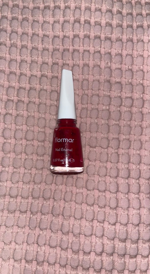 Flormar markasına ait parlak kırmızı renkte, 0.37 fl oz kapasiteli tırnak cilası.