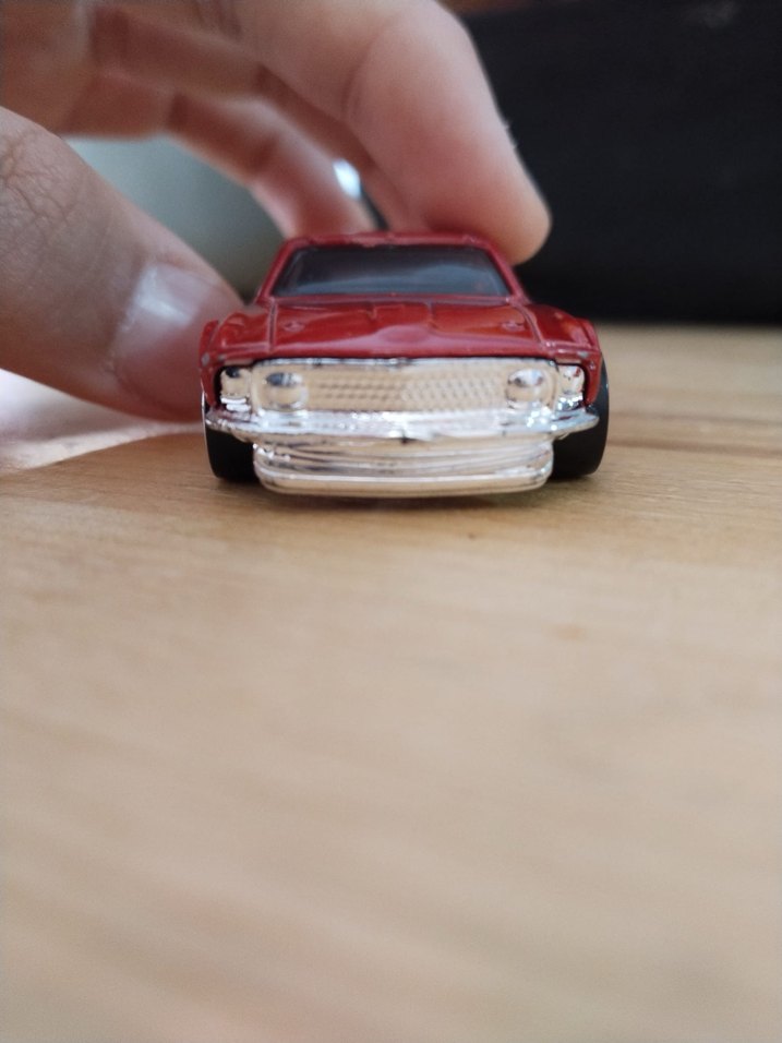 Parlak kırmızı renkte, ön ızgarası detaylı ve pürüzsüz yüzeye sahip kompakt oyuncak araba.