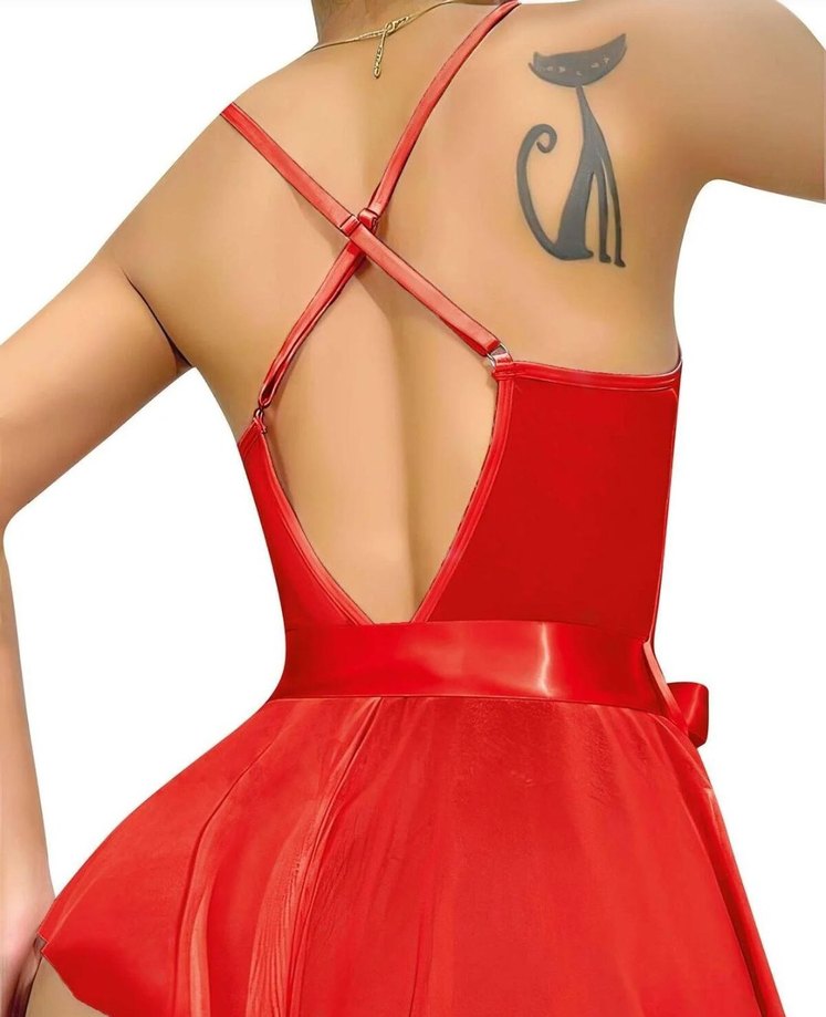 İnce askılı, sırtı çapraz detaylı, parlak kırmızı kumaştan yapılmış, vücuda oturan mini uzunlukta bir kadın geceliği. Etiketli üründür. S-M bedeni mevcuttur.