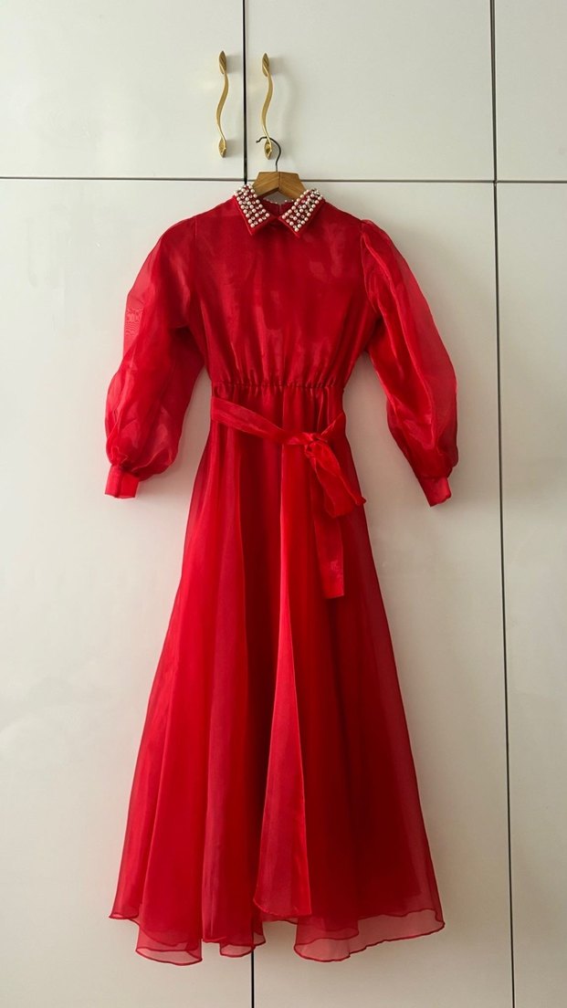 Kırmızı İnci Yakalı Elbise