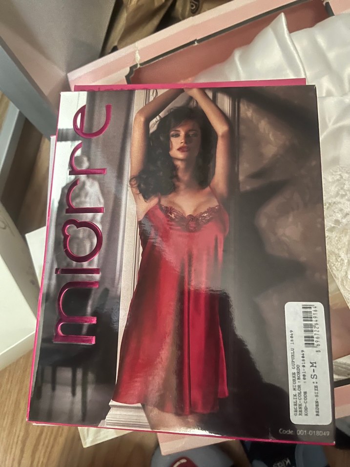 Parlak kırmızı, baskılı ve ip askılı, vücuda oturan midi gecelik.S/M beden hiç giyilmedi.