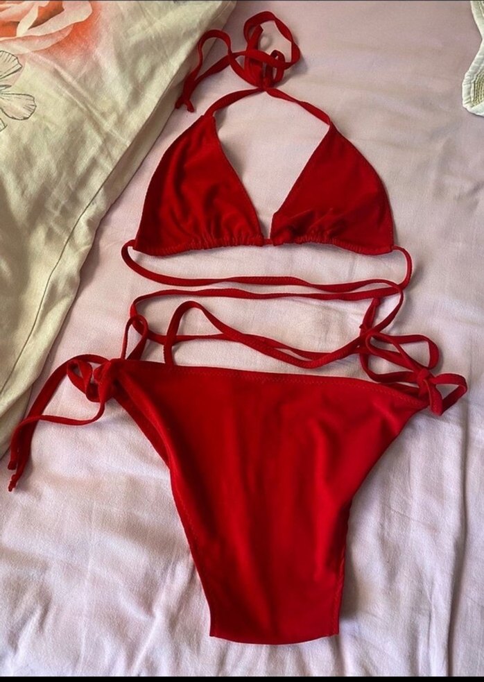Parlak kırmızı renkte, ipli ve drapeli tasarıma sahip, vücuda oturan kadın bikini takımı. Minimalist ve sokak stiline uygun, plaj için ideal.
