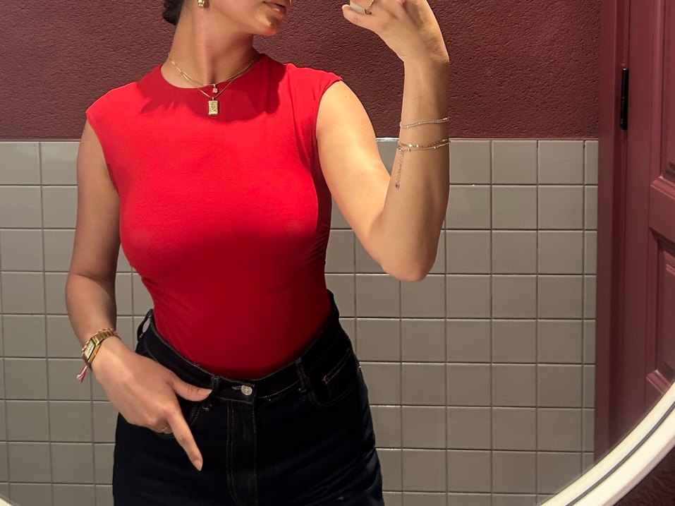 Parlak kırmızı bluz, günlük sokak stiline minimal ve cesur dokunuş katar. Zahmetsiz şıklık sağlar.