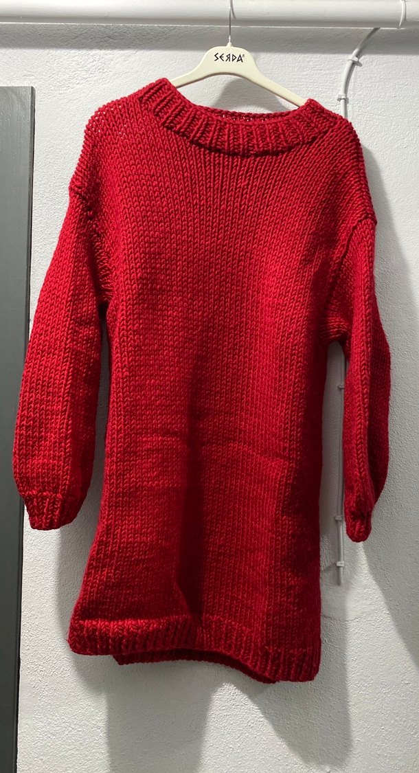 Parlak kırmızı renkte, yuvarlak yakalı ve uzun kollu, rahat kesim kadın el örgüsü kazak. Günlük kullanıma uygun, sade ve konforlu midi uzunluğundadır kendi ellerimle ördüm ama artık kalın şeyler giyemiyorum tunik boyundadır kışın kurtarıcı bir parça. El emeği olduğu için fiyatı böyledir m bedenden xl bedene kadar rahatlıkla olur