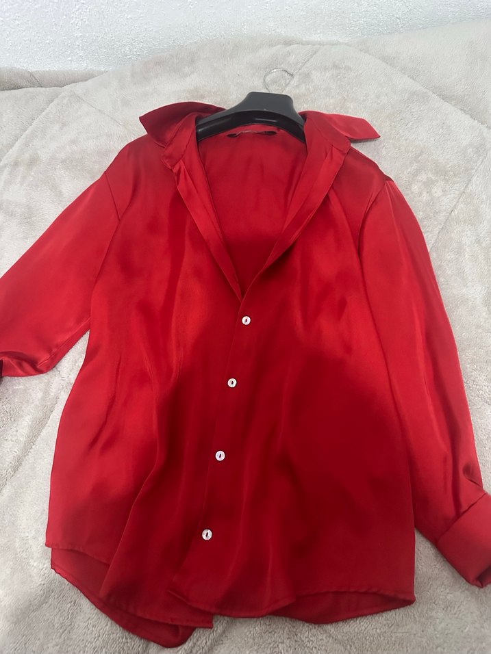 Parlak kırmızı renkte, düğmeli, yakalı, uzun kollu, bol kesim ve midi uzunlukta kadın gömleği. İpeksi dokusu ve sokak modası tarzıyla dikkat çeker.