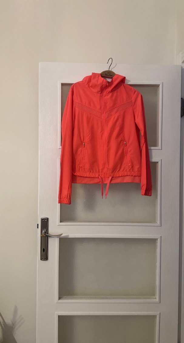 Dar kesim kadın ceketi, yüksek yakalı ve uzun kolludur. Fermuarlı cepleri ve parlak kırmızı sentetik kumaşıyla şık bir sokak stili sunar.
