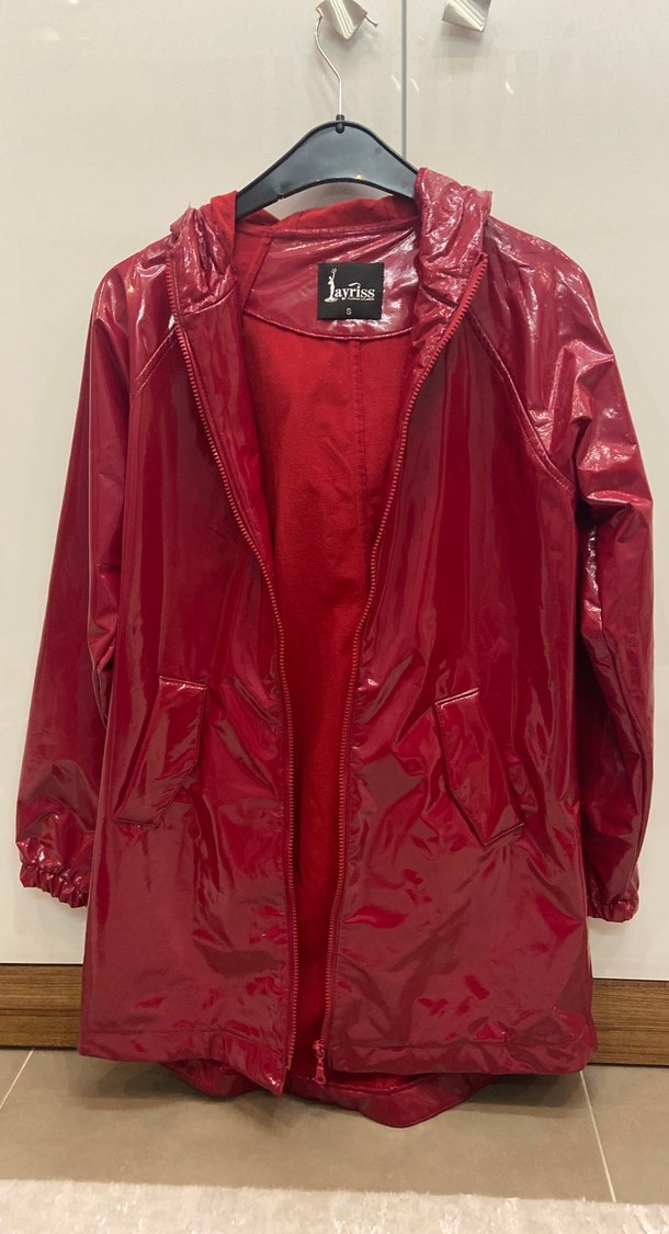 Parlak kırmızı renkli,uzun kollu ve bol kesim kadın yağmurluğu. Notlu yaka detayı ve sentetik kumaşıyla günlük sokak stiline uygundur. ️