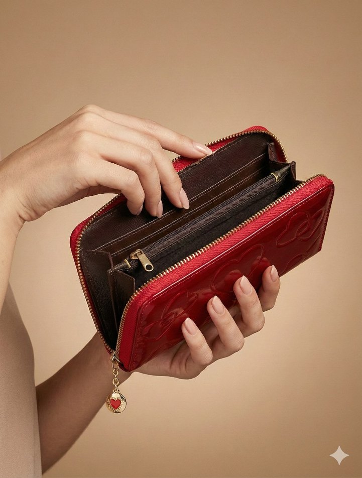Parlak kırmızı deri kadın cüzdanı, nakışlı desenlerle ve parlak yüzeyle öne çıkar. Cesur ve göz alıcı günlük kullanım için uygundur. 1 seneden fazla giymediğim tüm kıyafetlerimi, eşyalarımı satılığa koyuyorum. Kullanım izleri mevcut, görsellerde detaylı çekimleri vardır.