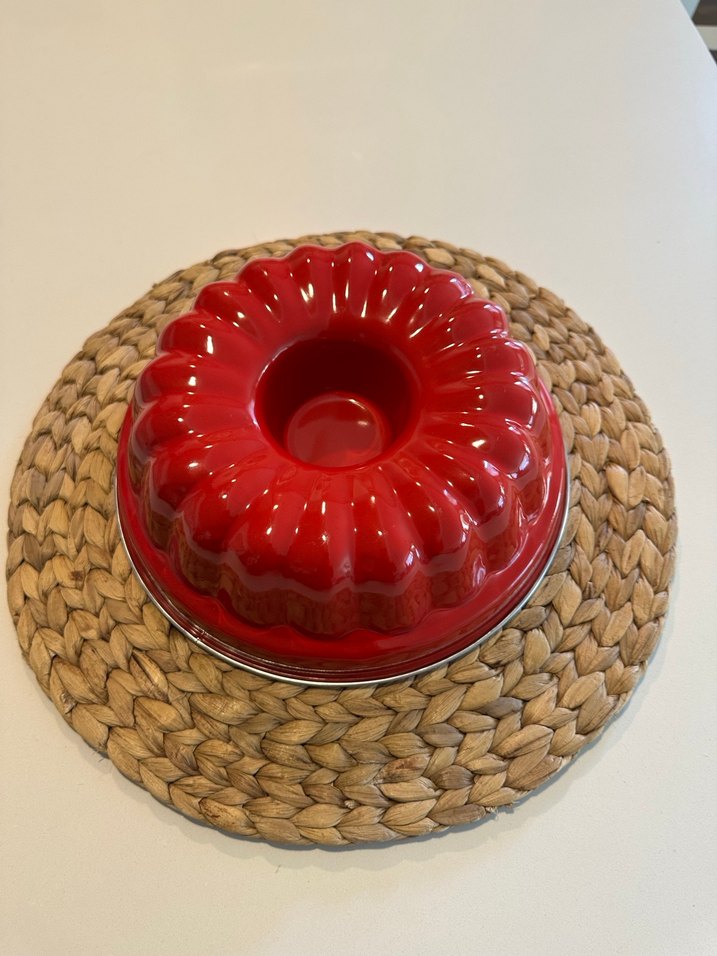 Parlak kırmızı renkte, ortası delik ve dalgalı tasarıma sahip kek kalıbı.