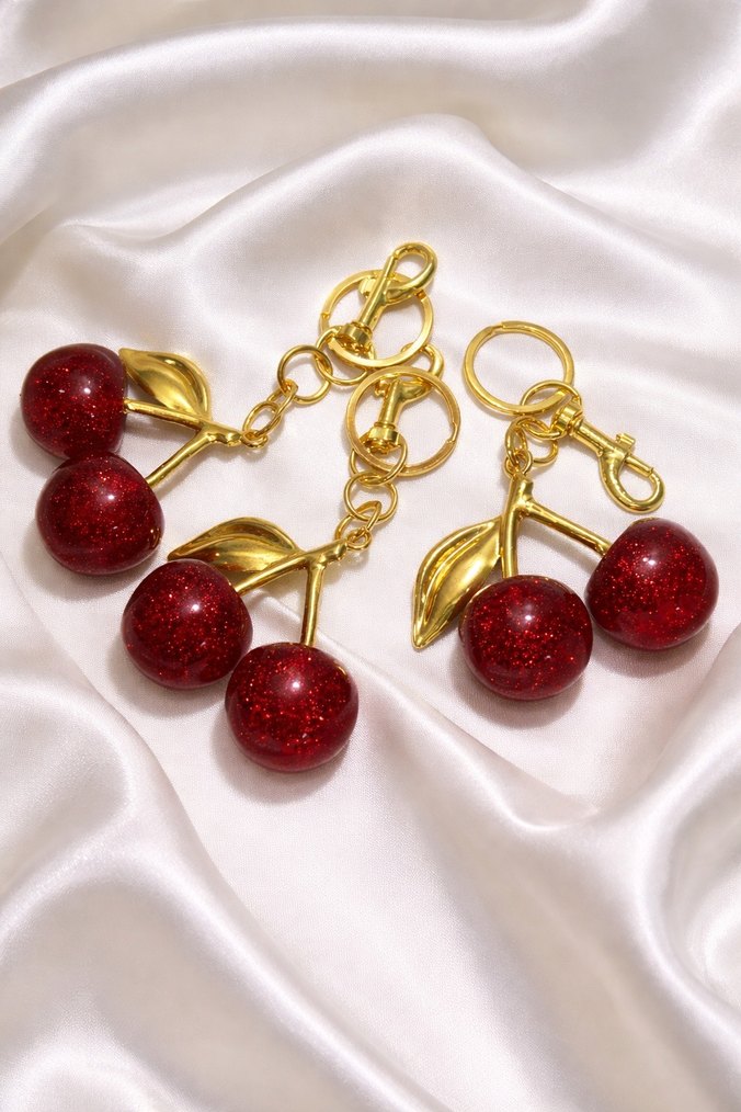 Parlak kırmızı kiraz figürlü, altın yaprak ve halkalı anahtarlık. Renkli, cesur ve göz alıcı bir tarz sunar.