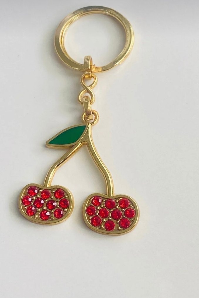 Parlak kırmızı taşlarla süslenmiş kiraz figürlü, zincir detaylı anahtarlık. Bohem ve ışıltılı tarz için uygun.
