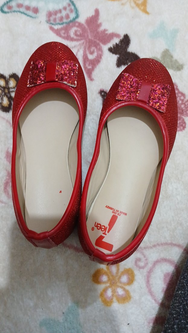 Kız çocukları için kırmızı renkte, simli fiyonk detaylı ve esnek kauçuk malzemeden yapılmış babet ayakkabı. Sade ve canlı tasarım.
